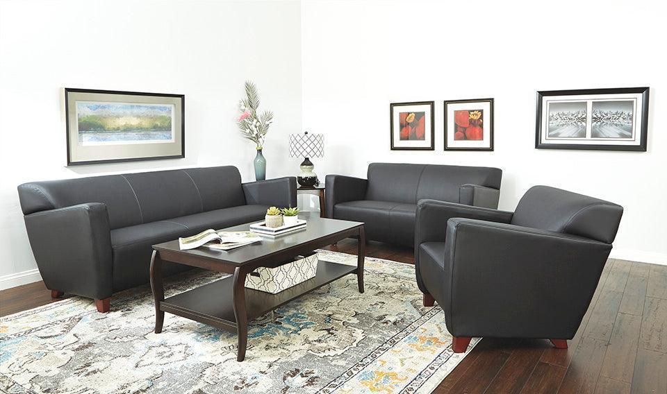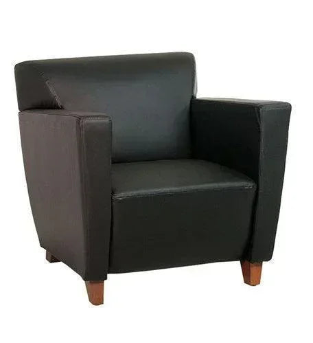 Smart and sophisticated, the Black Bonded Leather Club Series by OSP Furniture® is a favorite among designers. Timeless black leather highlights its modern silhouette while cherry-finished legs add stylish detailing. Relaxing in comfort is assured with its thick, padded seat and plush design.