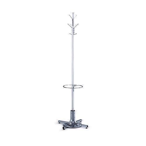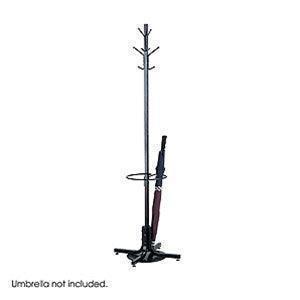 Design features four double hooks that securely hold up to eight garments plus an umbrella stand with drip pan.