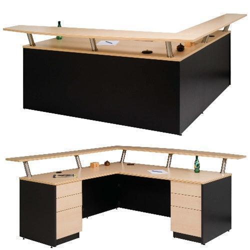 Welcome guests, clients or patients with this Deluxe L Shape Reception Desk in your office lobby or healthcare waiting room. Features metal post counter risers for a modern look. Full Modesty Panel and 3mm plastic edging