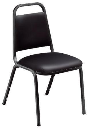 Fine seating at a fantastic price when you add the 9100 Series upholstered Value Stacker to any venue. This affordable stack chair brandishes a 1.5 inch -thick, pullover-style, foam-padded cushion covered with thick easy-to-clean vinyl. Plywood core within both the seat and tapered backrest which features a built-in handle for easy moving and stacking. A mighty 19-gauge square tubular steel frame includes under-seat bars to provide excellent support along with plastic glides to avoid marring floor surfaces. Safely stack up to 10 chairs, each with eight plastic bumpers attached to protect its attractive black powder-coated paint finish from scratching.