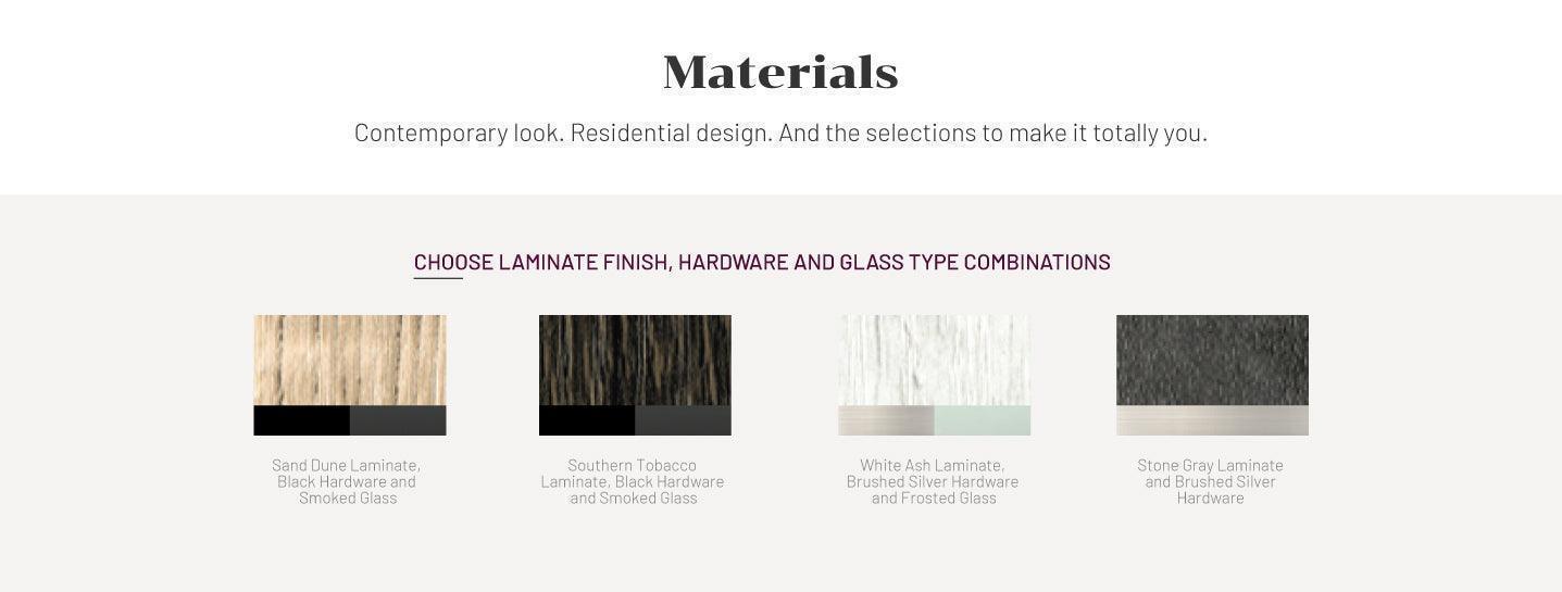 - Sand Dune and Southern Tobacco laminates come with Black hardware, and White Ash and Stone Gray premium laminates come with Silver