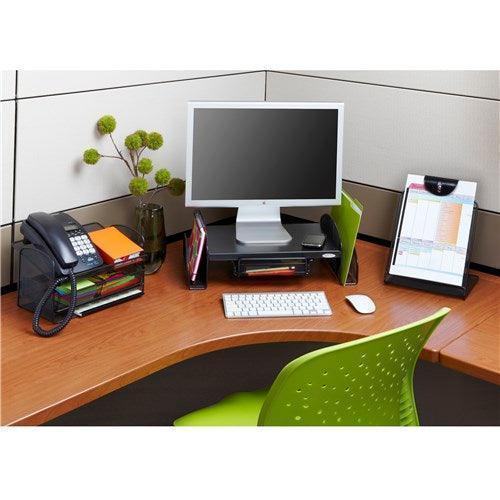 Steel mesh telephone stand features angled platform and a storafe drawer with adjustable, removable divider,