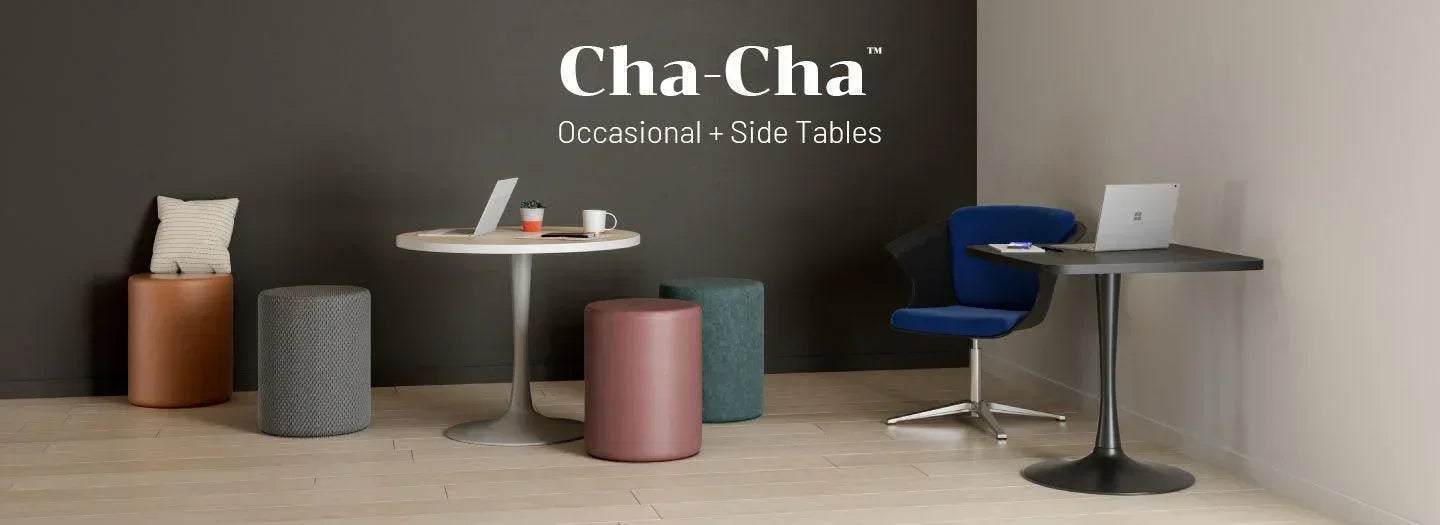 Cha-Cha Occasional Tables are the perfect solution to outfit open offices, co-working spaces, or any casual collaboration area. The durability of the high-pressure laminate worksurface, combined with the steel X-base or Trumpet base option, allows Cha-Cha to withstand the test of time. Quick Ship options available. Pair with stools and whiteboards for a perfect solution.
