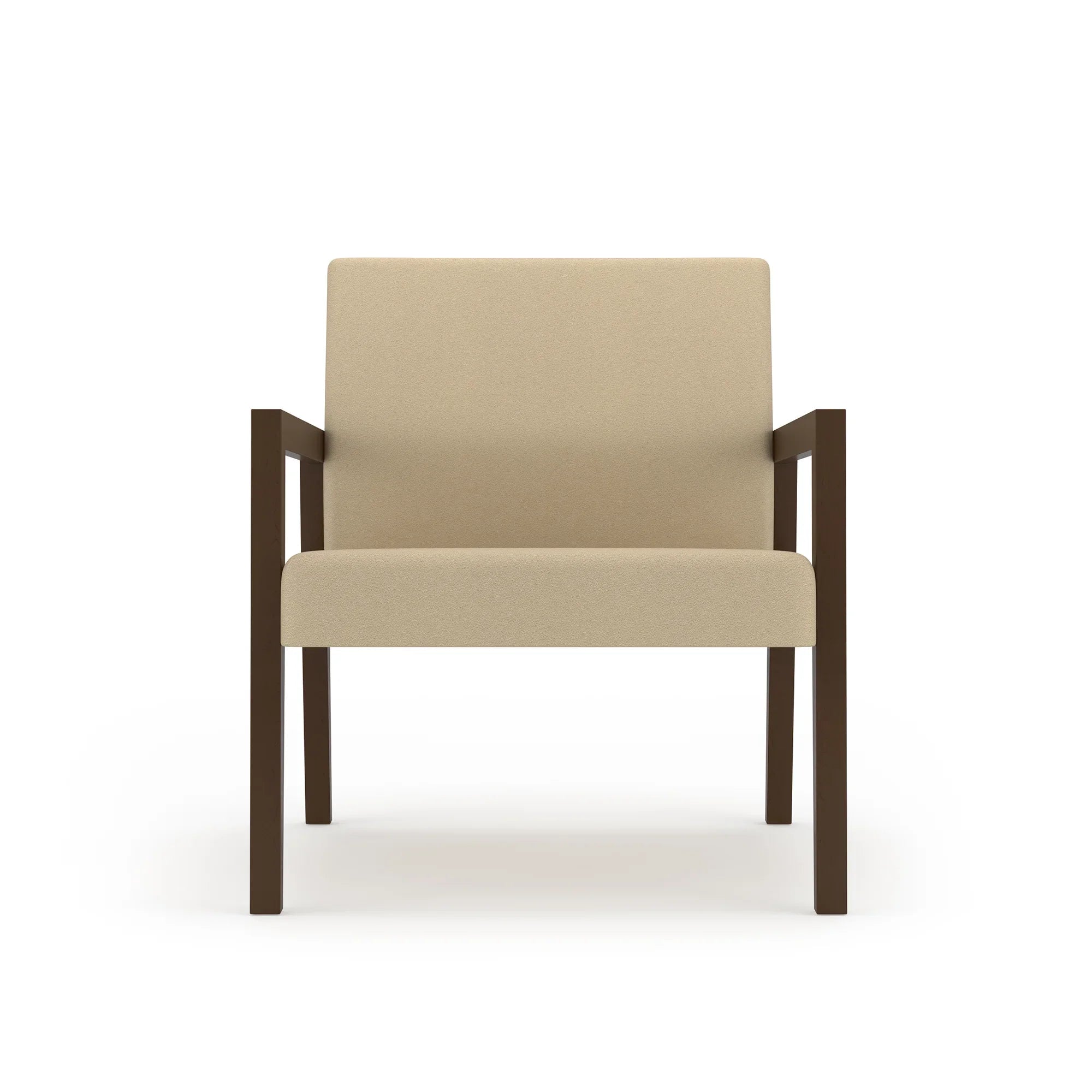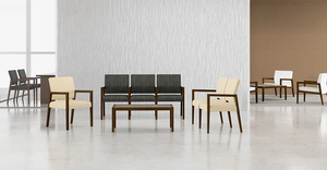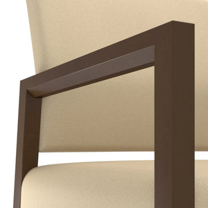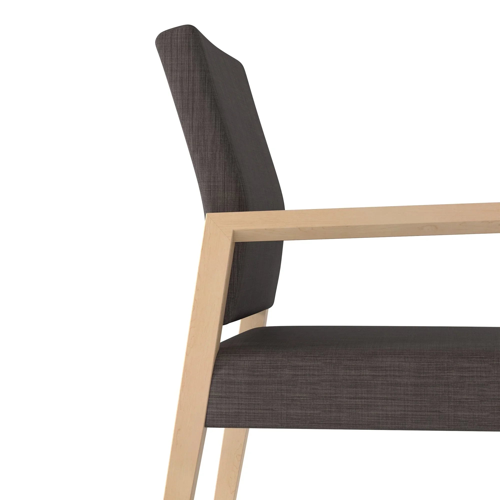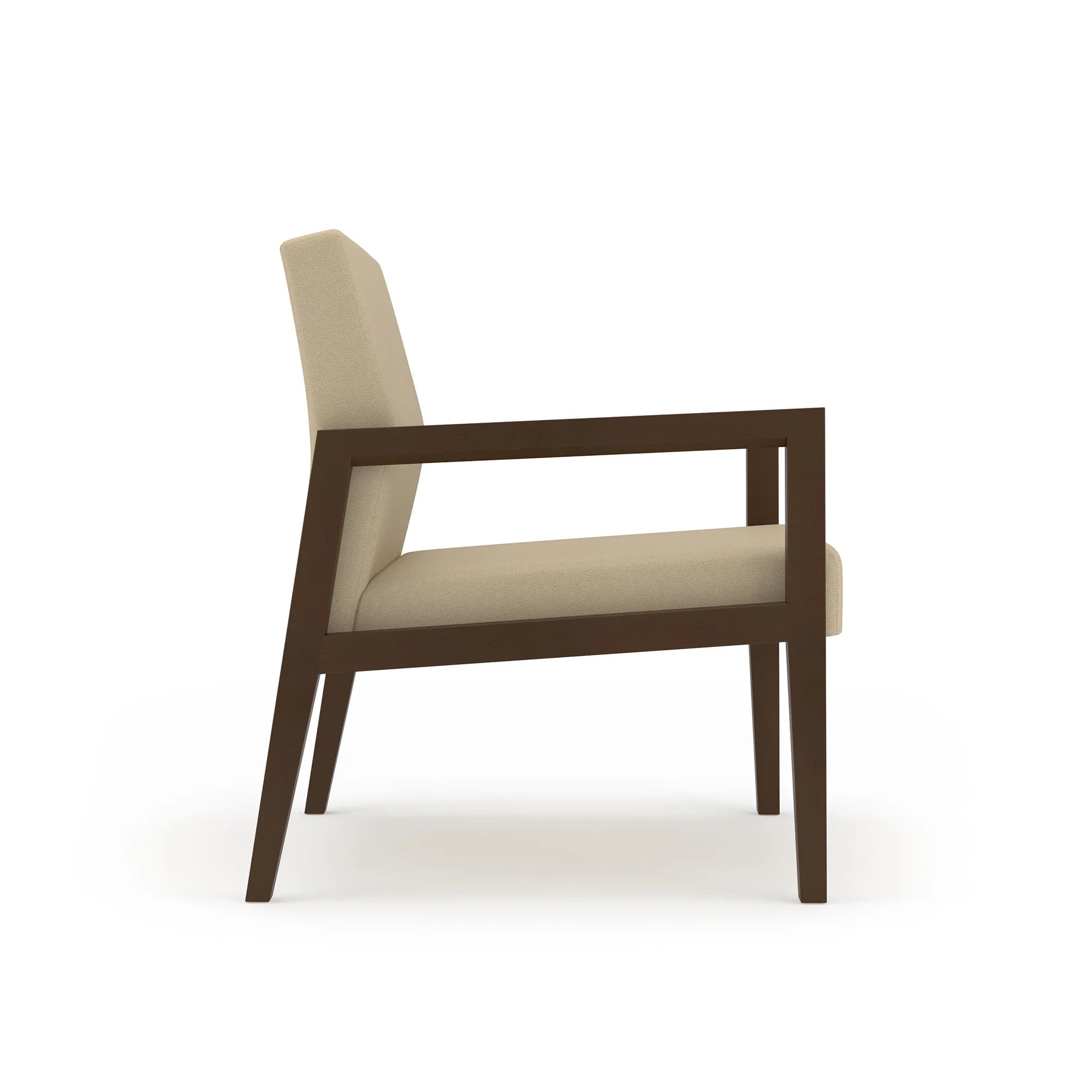 Contemporary geometric styling perfect for reception areas, lounges, and pull-up seating applications. Solid maple construction. Large selection of fabric and health care approved vinyl.