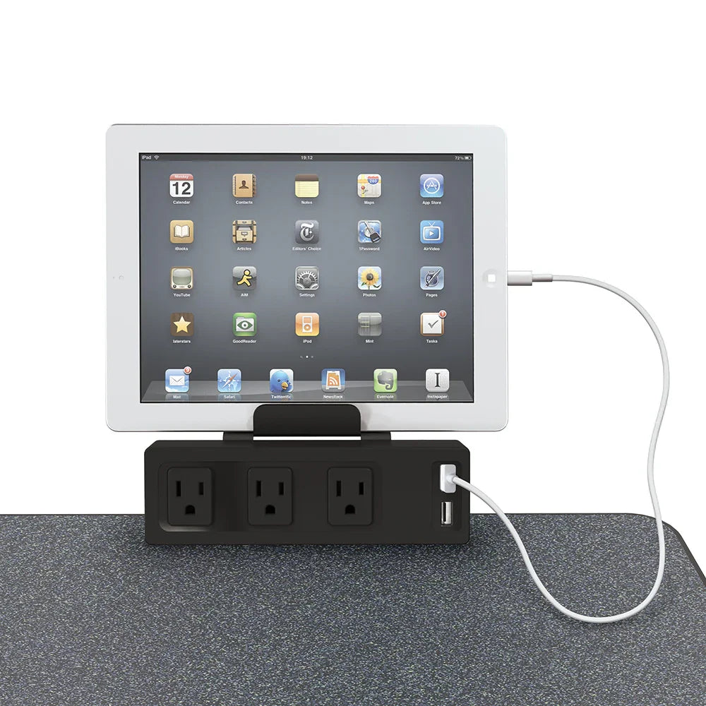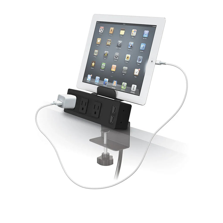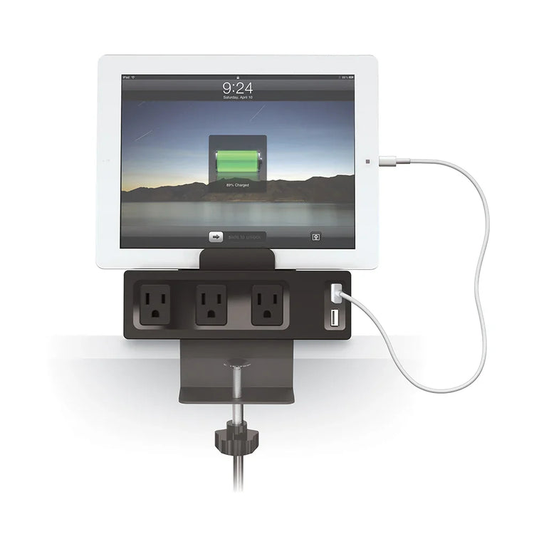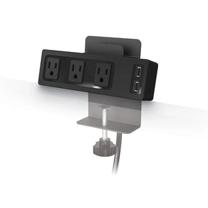 - The Clamp Mount Outlet & USB Charger adds instant convenient AC power and USB charging accessibility to your desktop.