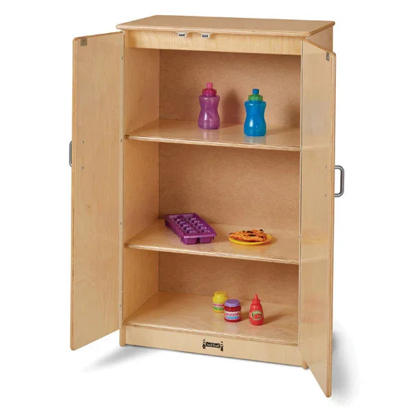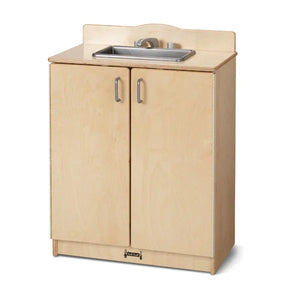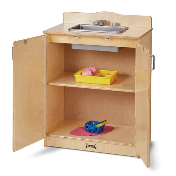Sized just for elementary-aged children and after school programs, this kitchen provides realistic play with wooden turn-button controls, “ice-maker”, and four stove “burners”. Magnetic catches help keep doors closed while chrome-looking handles and faucet provide a high-end aesthetic. Counter is 28.5" high.
