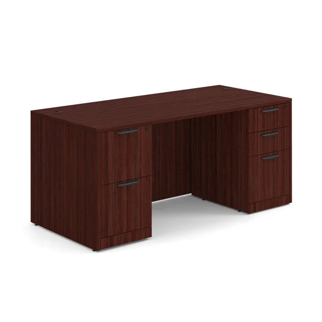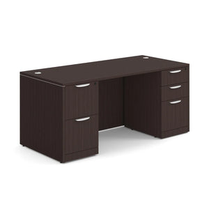 This double pedestal desk is designed for maximum storage and a commanding presence, featuring a mix of storage and file drawers, and is available in various color finishes. Offers a durable and long-lasting option for professional environments.