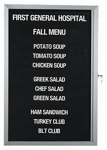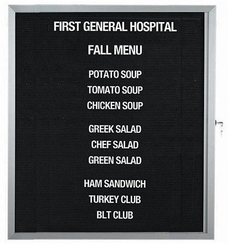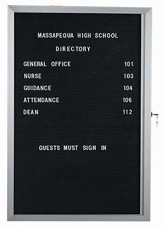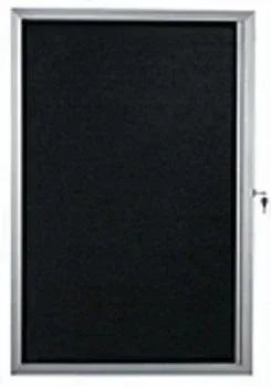 Neat, simple and affordable enclosed bulletin board with an Aluminum frame and Black felt covered