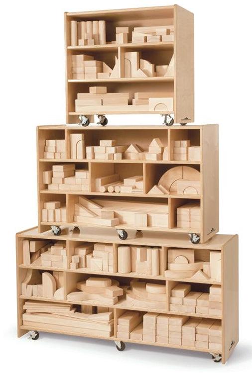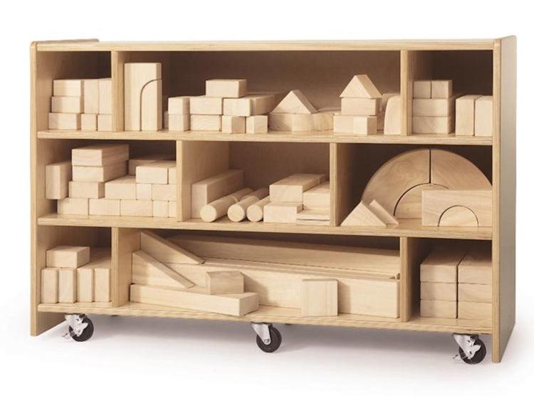 These best-seller block cabinets provide plenty of sturdy storage space for a variety of block shapes. Equipted with heavy duty non-marking lockable casters for easy mobility. Shown here is our Medium Block Cabinet with the WB0368 beginner block set [blocks sold separately]. Need a different size? Check out our WB0510 Small Block Cabinet or WB0520 Large Block Cabinet, each sold separately.