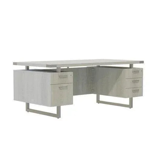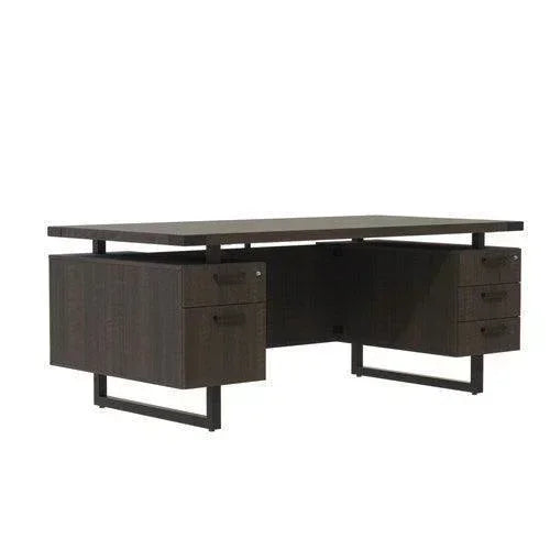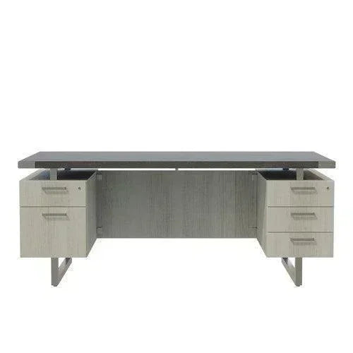 - Double Pedestal Executive Desk Features: includes a center drawer for convenient storage and a laminate modesty panel for additional privacy. Complete with double pedestals featuring one with three storage-sized drawers and one with a storage drawer and a file drawer accentuated with discrete brackets giving the appearance of a floating workstation. Pedestal has option of integrated power module with two standard and two USB outlets in the top drawer (MRPM power module sold separately). Pedestals comes keyed alike; for additional keying options contact customer service