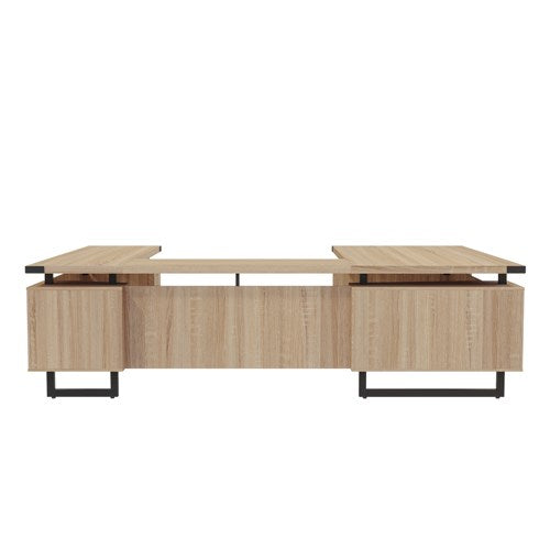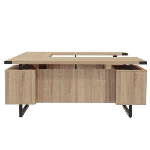 - Complete with double pedestals featuring one with three storage-sized drawers and one with a storage drawer and a file drawer accentuated with discrete brackets giving the appearance of a floating workstation