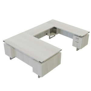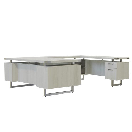 Mirella™ U-Shaped Configuration Desk features a contemporary design that provides a residential look, complemented with Brushed-Silver or Black Powder Coat accents and finishes. Credenza provides more storage and extra workspace. Sand Dune and Southern Tobacco laminates come with Black hardware, and White Ash and Stone Gray laminates come with Silver. Featuring a floating 1 5/8” thick work surface on top of Silver or Black standoffs. Also includes a laminate modesty panel for additional privacy. Comes complete with double pedestals featuring one with three storage-sized drawers and one with a storage drawer and a file drawer accentuated with discrete brackets giving the appearance of a floating workstation. Double pedestals have option of integrated power module with two standard and two USB outlets in the top drawer (MRPM power module sold separately). Pedestals are keyed alike; for additional keying options, please contact Customer Care. Set includes Desk, universal Bridge, Credenza and two Pedestals. Coordinates with Mirella™ Conference and Reception designs for a cohesive and professional look.
