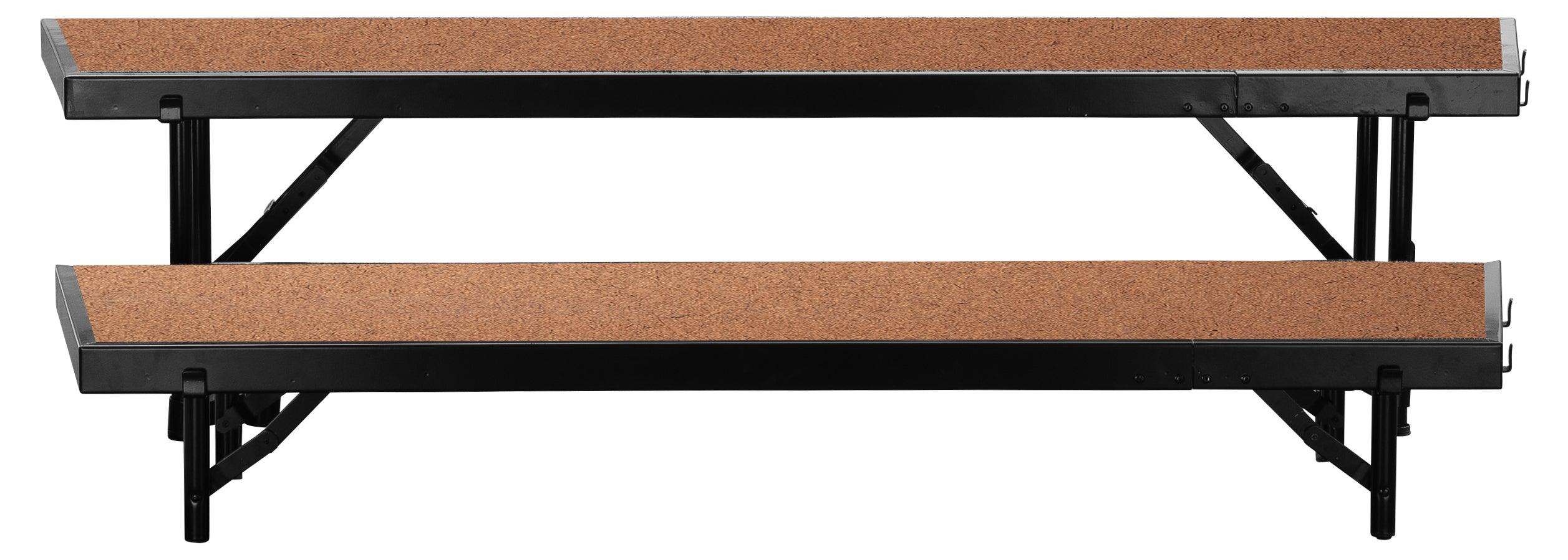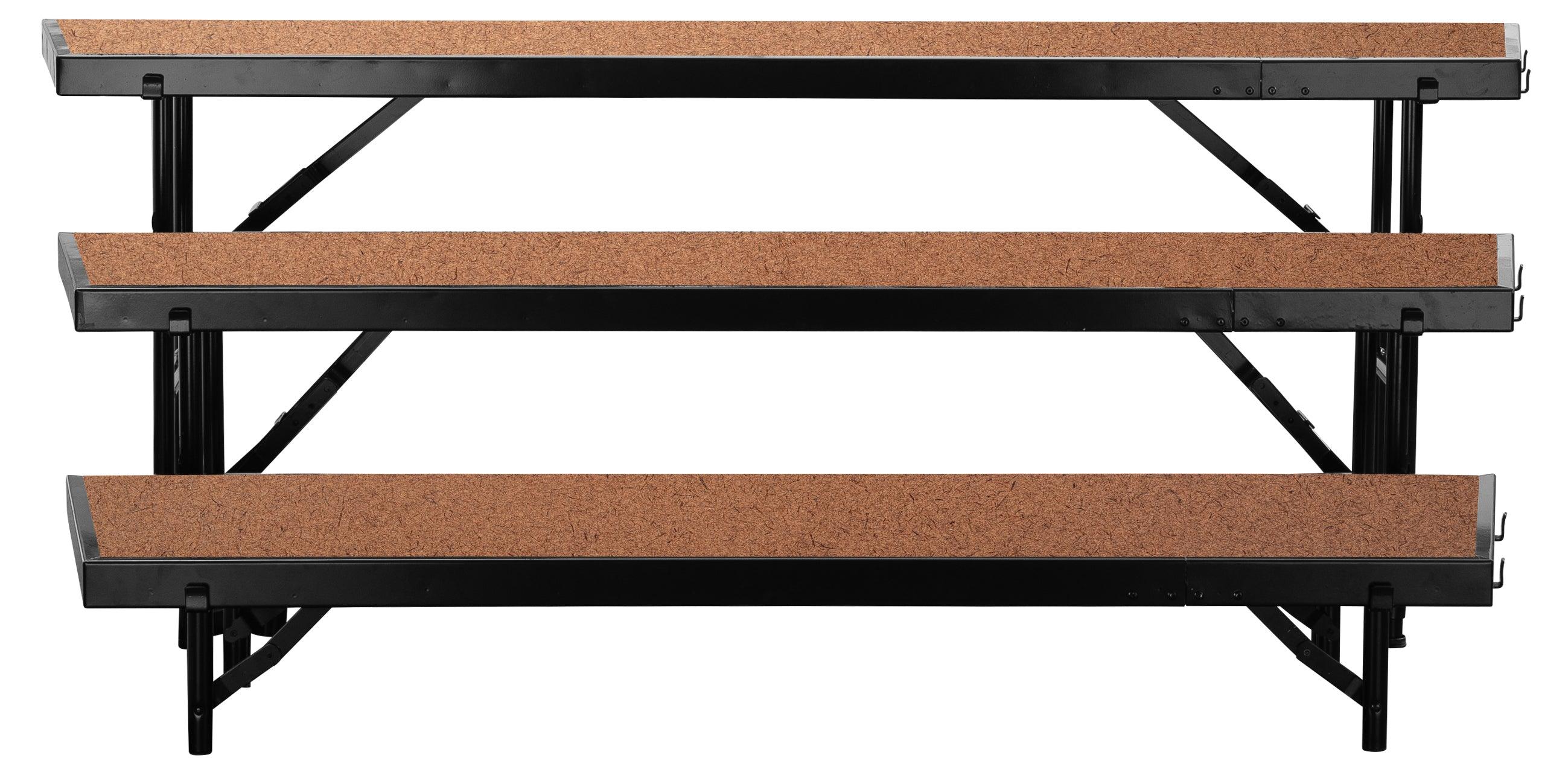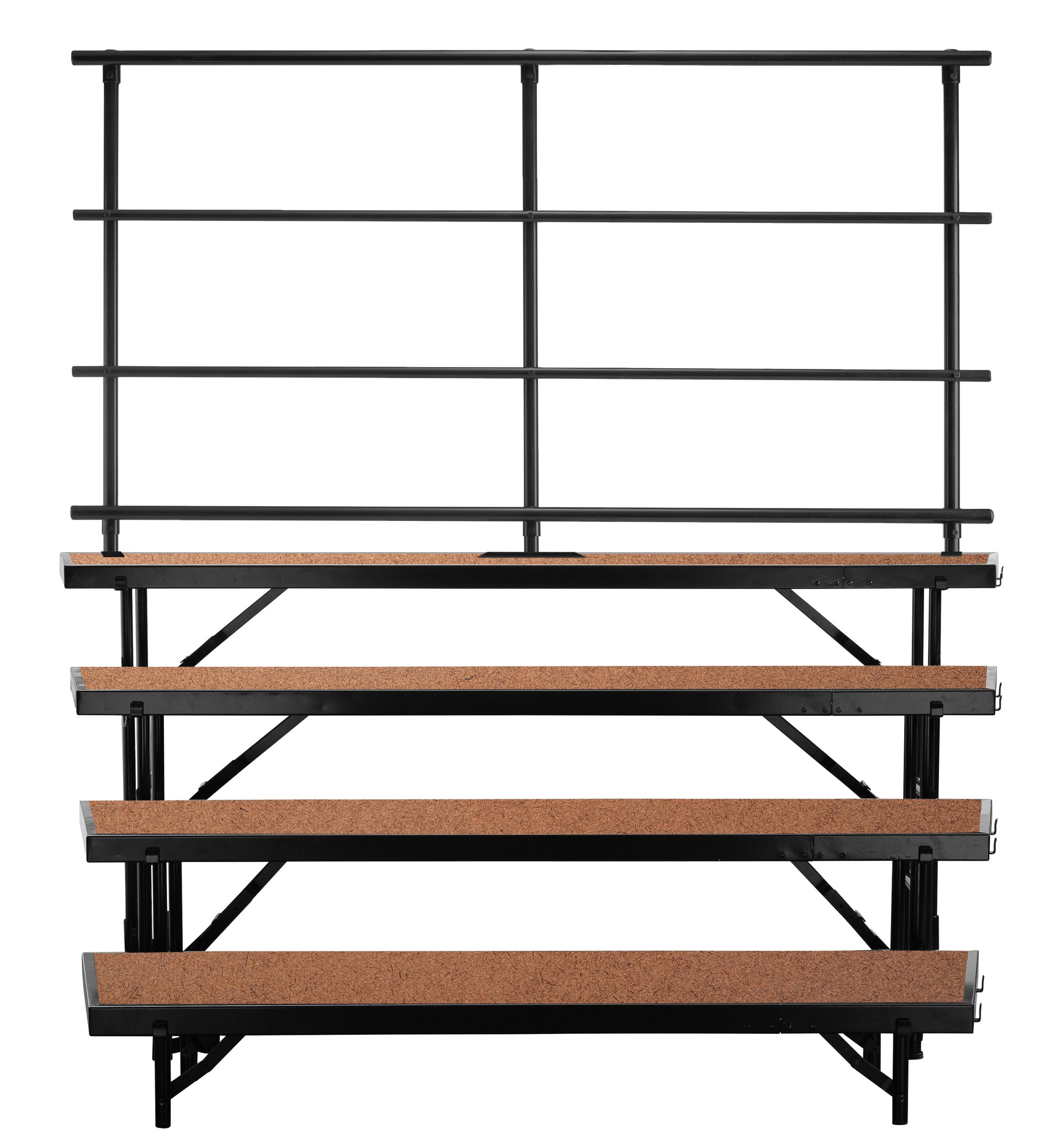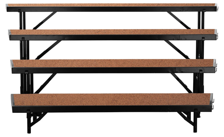 Rise to the occasion! The NPS Tapered Hardboard Multi-Level Standing Riser is the reliable and affordable choice for your school performances and assemblies. Users are supported by a heavy-duty, 16-gauge steel, black powder-coated frame. The premium 3/4 thick plywood deck is durable and features a firmly-affixed Hardboard Floor. Legs are constructed with 14-gauge steel tubing and feature simple and safe spring-loaded locking mechanisms allowing for quick set-up assembly and folds up easily for manageable portable storage. The stage offers a secure weight capacity of over 200 lbs. per square foot. High-impact plastic glides will ensure floors are protected from damage. Firmly welded ganging devices let users combine equal-height stages to create a large single stage platform or assemble different sizes to create standing riser configurations. Ships fully assembled.