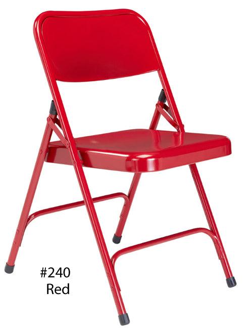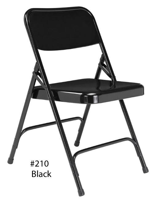 Our 200 Series premium all-steel institutional-grade folding chair features a heavy-duty powder-coated 18-gauge tubular frame with a 2 1/4 inch frame strengthener on each side of the seat. Two double-riveted U-braces - one in front and one in back - securely support the double-hinged legs. The seat is designed with a waterfall-style front for added comfort. A supportive full-sized double-contoured backrest features curled safety edges and is electromagnetically tack-welded to the frame. Color-coordinated V-tip stability plugs provide added reinforcement at the frame's junction and matching replaceable glides prevent floor damage. The 200 Series meets MAS Certified Green and ANSI/BIFMA standards.
