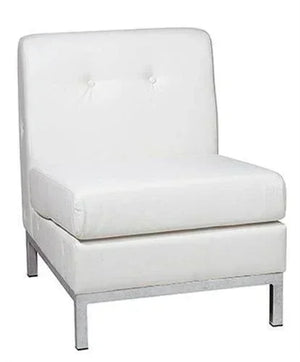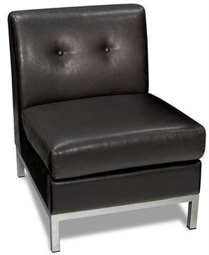 With sophisticated lines, our armless chair modular section piece, will work in tandem with our right-facing, corner piece or left-facing armchairs to create a seating sectional exacting your personal taste. Covered in soft and supple faux leather, a sumptuous button tufted back, a seat supported by coil box-spring and sinuous spring support all add up to a durable and appealing design statement. Designed to work alone with an occasional side table or our matching charging console or add more pieces for the size flexible to your seating area. Ideal for a design centric living room, or a minimalistic family room. GREENGUARD certification and durable steel base finished in chrome will stand up to the rigors of guest seating in a well-appointed office or commercial setting. Put together a well-designed work or living space using the whole collection of upholstered pieces and matching occasional tables available in white, black and woodgrain laminate.