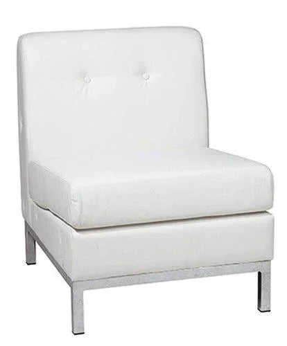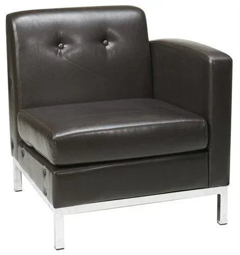 With sophisticated lines, our Wall Street Corner Sofa will work in tandem and coordinate with our armless, corner piece or left-facing armchairs to create a seating sectional exacting your personal taste. Covered in soft and supple faux leather, a sumptuous button tufted back, a seat supported by coil box-spring and sinuous spring support all add up to a durable and appealing design statement. Designed to work alone with an occasional side table or our matching charging console or add more pieces for the size flexible to your seating area. Ideal for a design centric living room, or a minimalistic family room. GREENGUARD certification and durable steel base finished in chrome will stand up to the rigors of guest seating in a well-appointed office or commercial setting. Put together a well-designed work or living space using the whole collection of upholstered pieces and matching occasional tables available in white, black and woodgrain laminate.