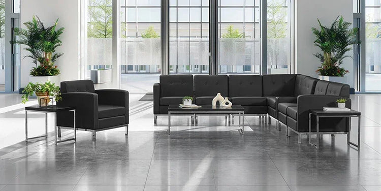With sophisticated lines, our left-arm modular section piece will work in tandem with our armless, corner piece or right armchairs to create a seating sectional exacting your personal taste. Covered in soft and supple faux leather, a sumptuous button tufted back, a seat supported by coil box-spring and sinuous spring support all add up to a durable and appealing design statement. Designed to work alone with an occasional side table or our matching charging console or add more pieces for the size flexible to your seating area. Ideal for a design centric living room, or a minimalistic family room. GREENGUARD certification and durable steel base finished in chrome will stand up to the rigors of guest seating in a well-appointed office or commercial setting. Put together a well-designed work or living space using the whole collection of upholstered pieces and matching occasional tables available in white, black and woodgrain laminate.