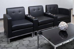 With sophisticated lines, our right facing-arm modular section piece, will work in tandem with our armless, corner piece or left-facing armchairs to create a seating sectional exacting your personal taste. Covered in soft and supple faux leather, a sumptuous button tufted back, a seat supported by coil box-spring and sinuous spring support all add up to a durable and appealing design statement. Designed to work alone with an occasional side table or our matching charging console or add more pieces for the size flexible to your seating area. Ideal for a design centric living room, or a minimalistic family room. GREENGUARD certification and durable steel base finished in chrome will stand up to the rigors of guest seating in a well-appointed office or commercial setting. Put together a well-designed work or living space using the whole collection of upholstered pieces and matching occasional tables available in white, black and woodgrain laminate.