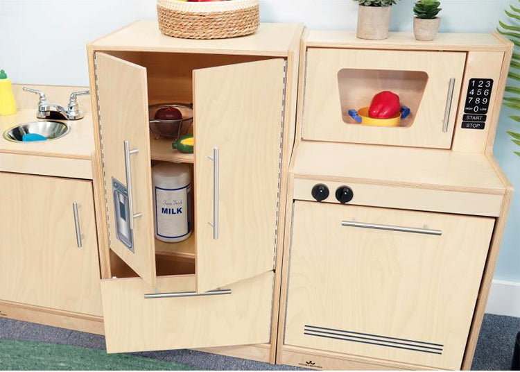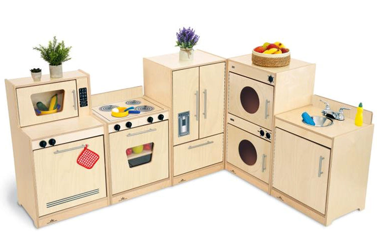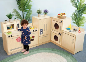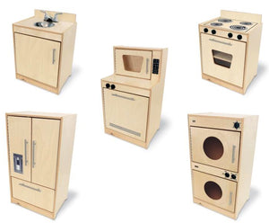 Contemporary Complete Kitchen Ensemble is full of delightful character. Features a fresh contemporary design, natural color finish, cabinet handles in matte chrome finish, knobs that click, a real chrome faucet with working handles, stainless sink basin and realistic printed details to inspire a preschooler's imaginative play for hours. Thoughtful safety features include smoothed edges, eased corners and doors attached by top-to-bottom continuous length piano hinges to prevent little fingers from getting pinched. The five-piece set includes one each of the following: WB7410 Contemporary Dishwasher and Microwave, WB7420 Contemporary Stove, WB7430 Contemporary Sink, WB7440 Contemporary Refrigerator and WB7450 Contemporary Washer / Dryer. It's a complete modern kitchen ensemble! Constructed in beautiful, durable birch plywood with no visible screws or joinery for a nice finished furniture look in natural UV finish that won't fade and withstands rigorous use. Made in USA. GreenGuard™ Gold certified. Lifetime Warranty. Certified antimicrobial.