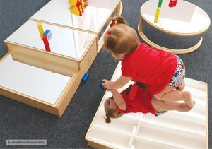 Floor mirror shapes for first-movers! Mirrors are important tools that foster a young child's self-awareness, self-esteem, intellectual curiosity and cognitive development. In an inventive twist, we applied safe, shatterproof acrylic mirrors on a variety of block shapes to encourage a first-mover's mobility, coordination and confidence through exploration and play.