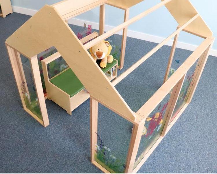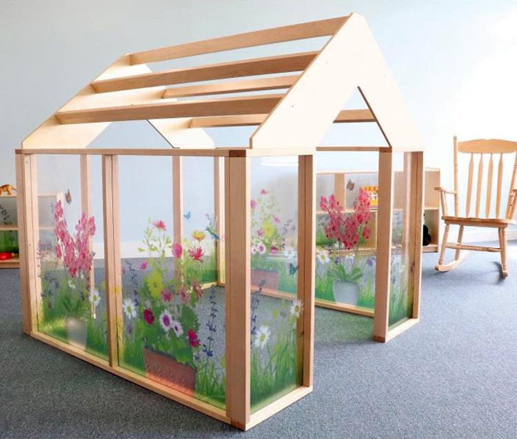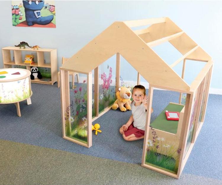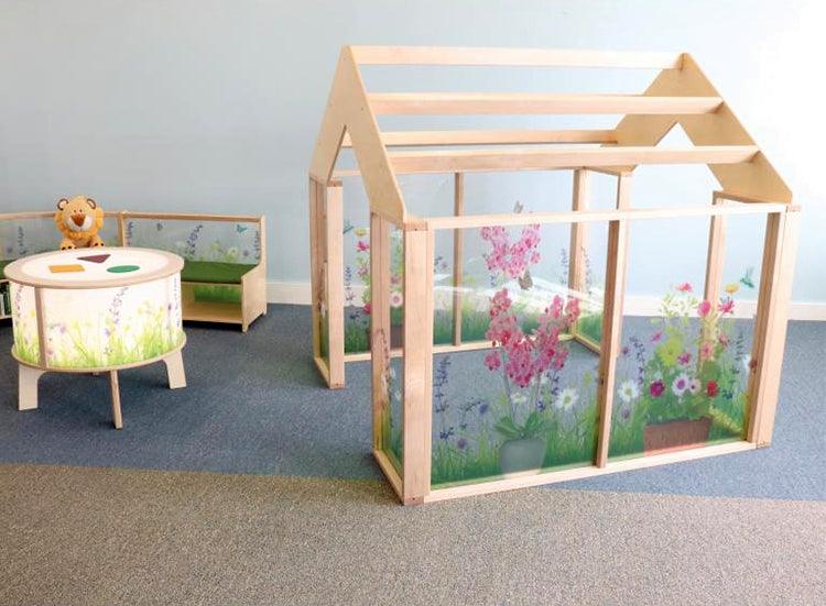 My-size indoor greenhouse! Perfect as a preschool or kindergarten classroom space for STEM / STEAM, Design features wide door openings, an open pergola-style roof and realistic wildflower fields and plants printed on safe, shatterproof acrylic panels. Coordinates with all other pieces [each sold separately] in our award-winning biophilia inspired Nature View Collection.