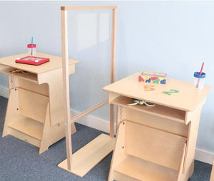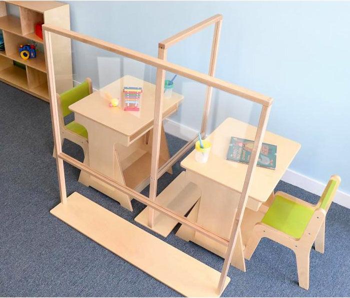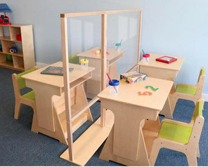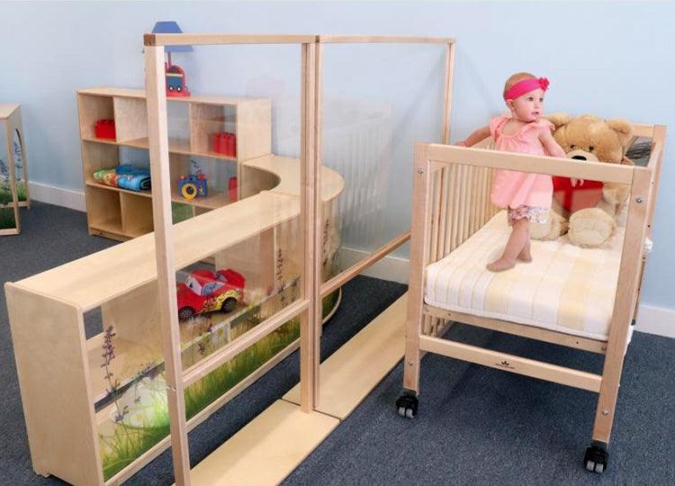 Floor standing partition provides effective, economical sanitary protection for an Early Learning environment without compromising visibility for child supervision. The partition dimensions are ideally suited for use between our cribs, desks, tables, literacy furniture and bench seating [each sold separately]. Available in two widths 25"W and 49"W