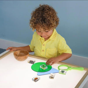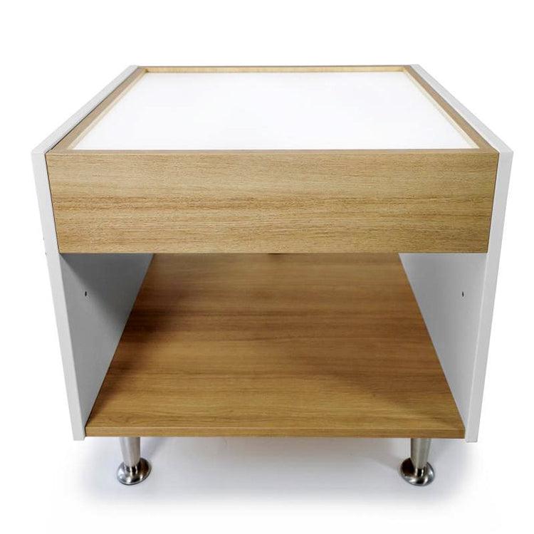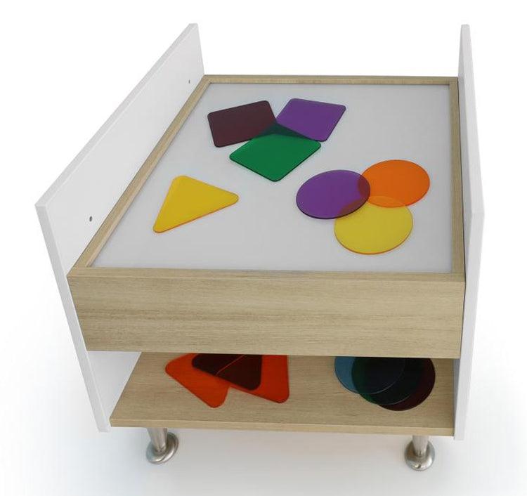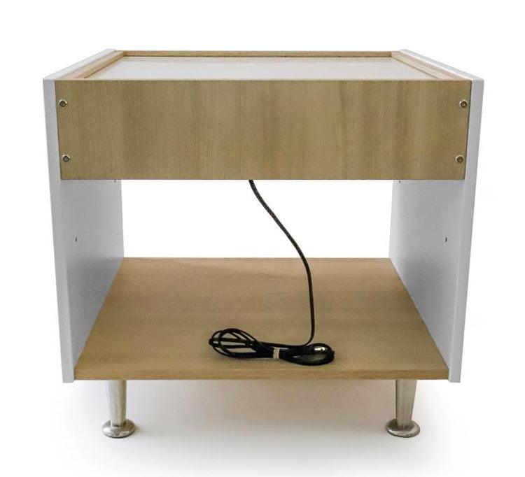 Put the light table anywhere and watch children engage! Table surface height is adjustable from 18" to 24". The LED lighting system displays brighter and more uniformly distributed light, uses less electricity and produces less heat. Ships ready to assemble and coordinates perfectly with all other pieces in the sophisticated chic and thoroughly modern elevatED™ Collection. Constructed in refined beautiful 3/4" white and textured white oak melamine that withstands rigorous use, offset by brushed nickel legs with integrated pads to protect floors.