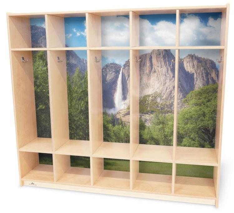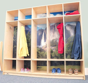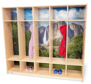 Nature View Captivating mountain scene printed inside the locker conveys a peaceful, calming welcome to children at the start of each day in the classroom. Five roomy sections accommodate 10 students and keep coats, footwear, backpacks and lunch boxes separate and organized. Each coat compartment has two sturdy double hooks, one mounted on each inside wall, and a seat that's just the right height for preschoolers to sit on while changing shoes. Includes wall-attached brackets for safety and floor glides. Constructed in beautiful, durable 15mm birch plywood with no visible screws or joinery and 1/4-inch back board for a fine finished look