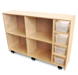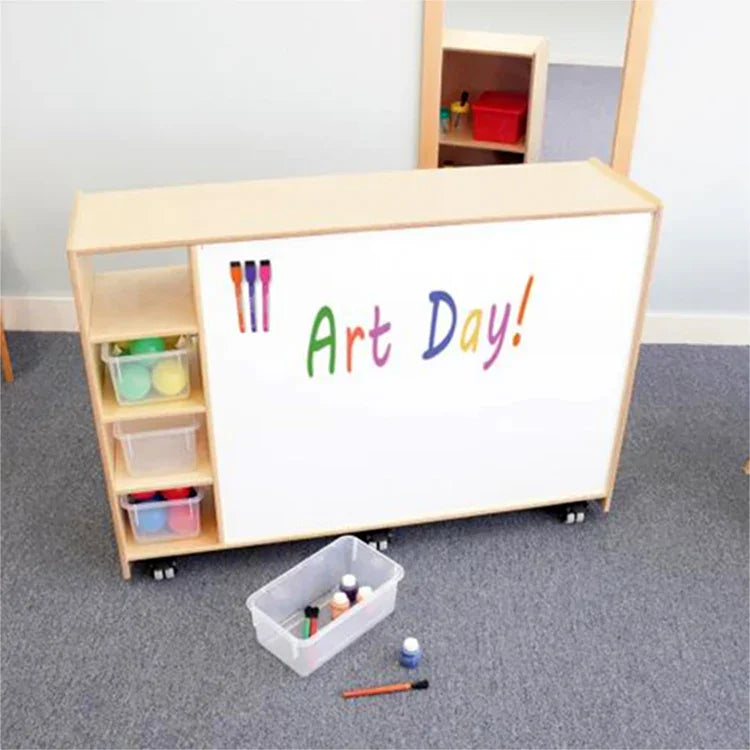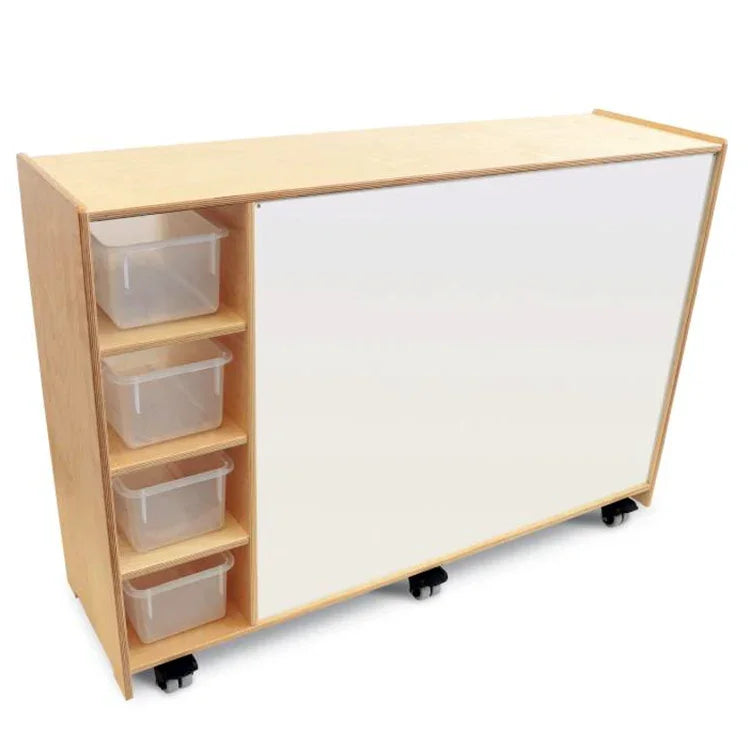 Perfect for classroom instruction and activities! The front is a high quality magnetic marker board with four fixed shelves that provide front to back access and hold four plastic trays [included]. The back features four spacious storage compartments that accommodate oversized books, manipulatives, toys, supplies or other large materials. Mounted on six lockable heavy duty non-marking casters that enable the cabinet to roll out of the way easily.