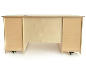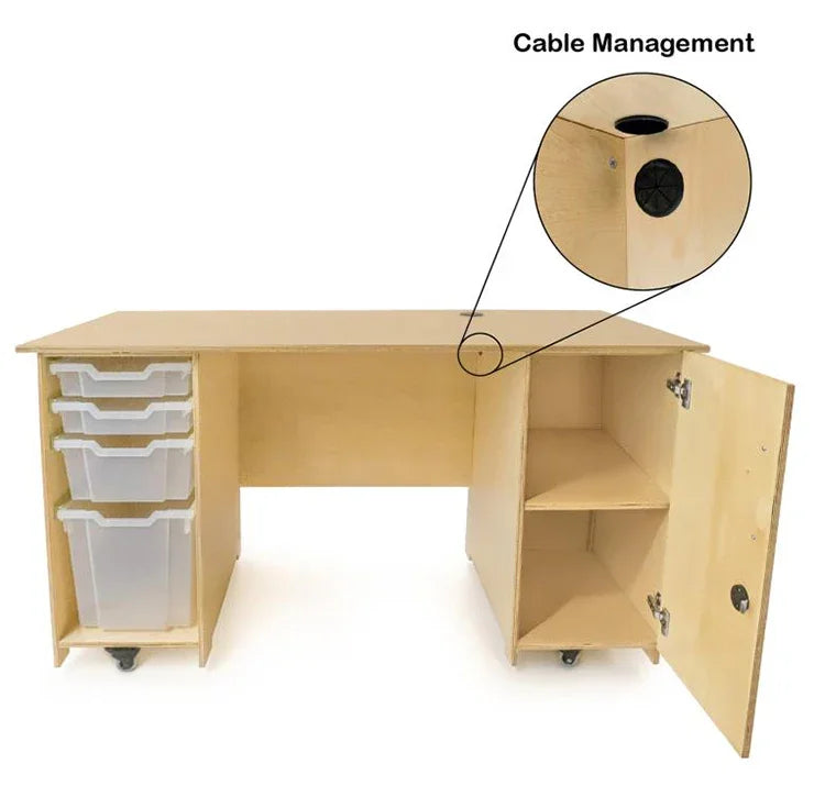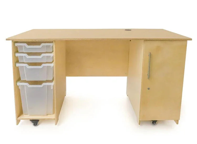 Specially-built desk for Early Childhood teachers! Part of Whitney Brothers® Teacher's Collection, this double pedestal desk features a generous work surface with grommets for handy cable managment. The left pedestal includes drawer glides that accommodate two shallow, one medium and one large Gratnell tray [all included]. The right pedestal features an adjustable internal shelf and grommet located in a discrete location; an exterior mounted locking door mounted on two sturdy European soft-close hinges for safety and a satin chrome handle; and an adjustable shelf that provides ample storage space for a computer or other electronics or valuables that need to be secured under lock and key. A center modesty panel completes the finished look. Mounted on four heavy duty non-marking lockable 2-inch casters