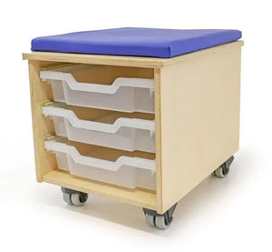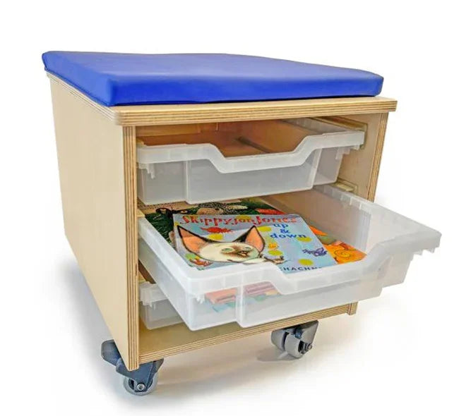 Comfortable mobile teacher seat with ingenious storage, puts the teacher at the ideal height for reading or presenting to curious young minds. Part of the Whitney Brothers® Teacher's Collection. Mobile stool features heavy duty non-marking 2" casters that lock. Drawer glides that accommodate three shallow Gratnell trays [included] to store books, activities and teaching aids. Removable 1" thick vinyl covered high density foam cushion for outstanding comfort.