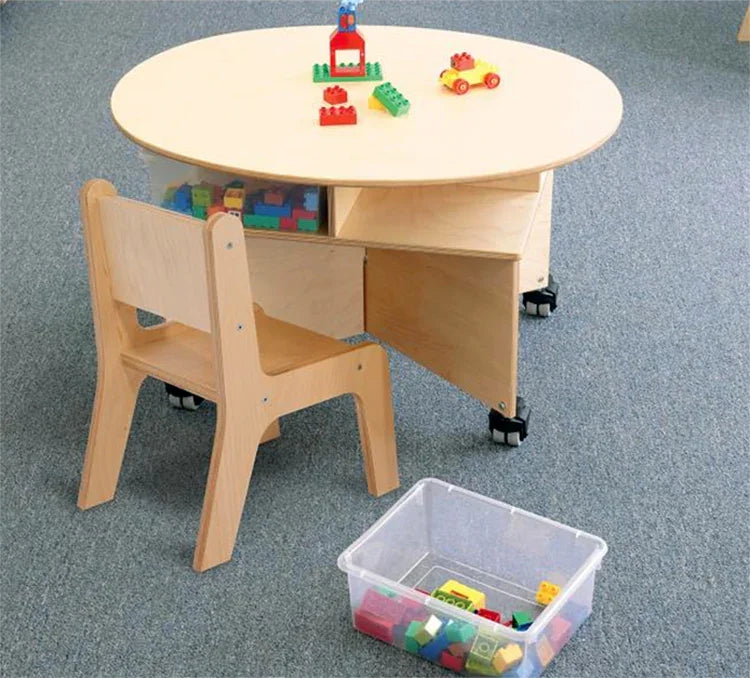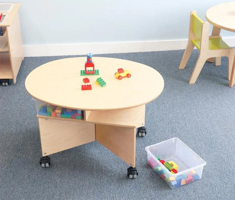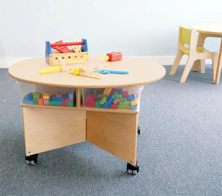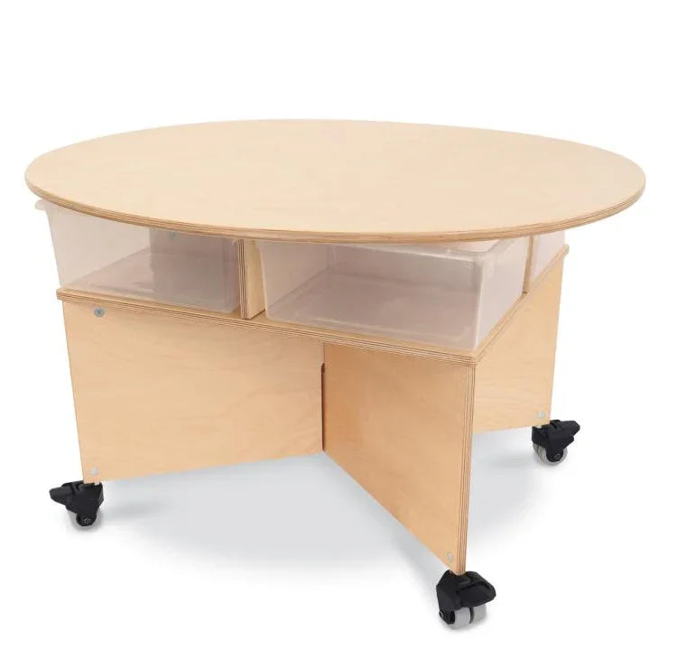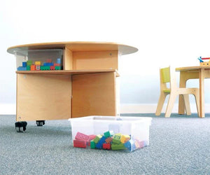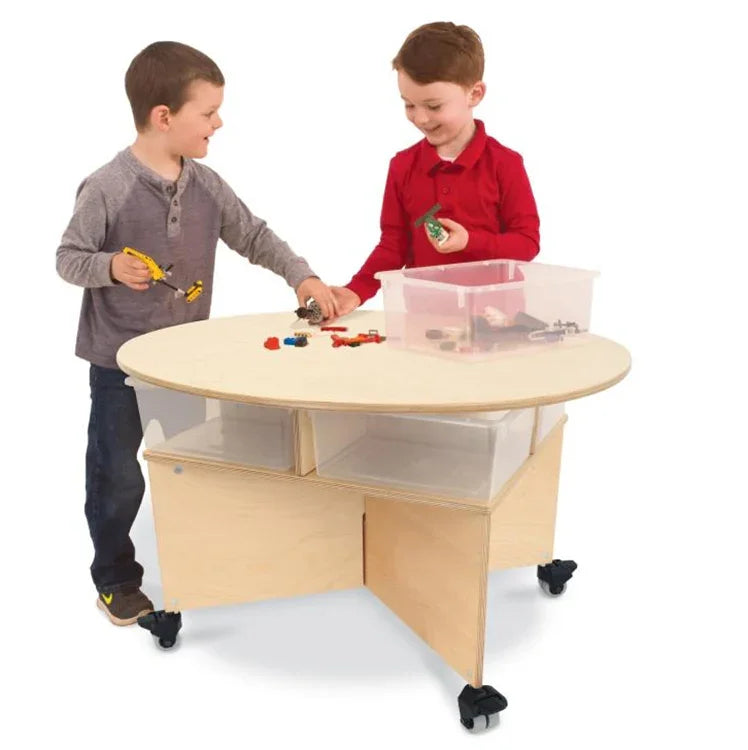 Collaboration table for up to four preschoolers! Unique pleasant oval design shape of this table easily accommodates four seated or standing children. Base is a sturdy, stable, symmetrical design featuring a clever shelf nested under the table surface that holds four clear plastic trays [included] for classroom materials and makes clean up a snap. Mounted on four heavy duty non-marking lockable casters for handy mobility. The table at 29.5"W easilly fits through standard door openings.