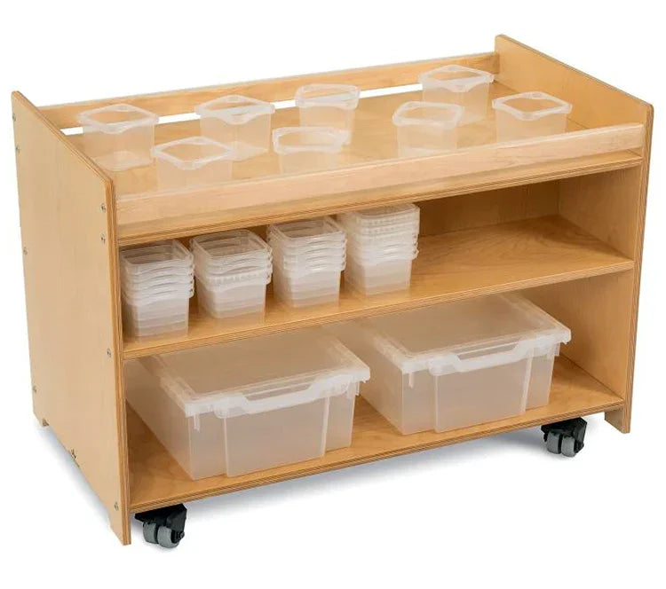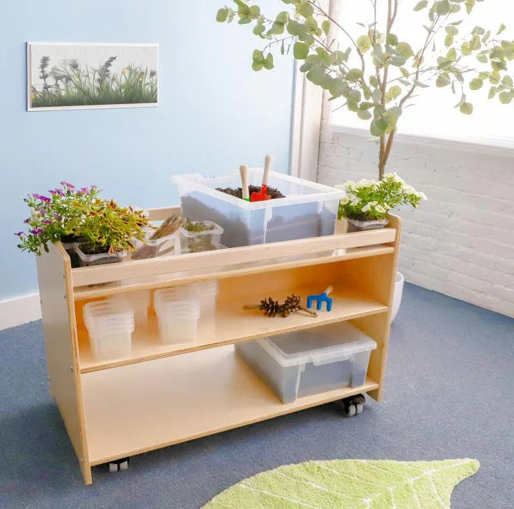 Ideal for STEM in Early Learning! Our mobile garden center brings nature into the classroom and engages children in hands-on learning about how plants grow when they plant seeds, water the soil and follow the evolution of plant life. Stylish, sturdy and mobile, the cabinet features a top shelf that accommodates 28 included clear plastic planting containers, a middle shelf with a vertical center divider that creates a storage compartment on each side, and a bottom shelf compartment that accommodates two Gratnell trays with lids [included] to store additional materials such as seeds, plants or soil [not included]. Mounted on four heavy duty non-marking lockable casters for mobility, the 19.5"W cabinet easily fits through standard door openings. Need a planter stand instead? Check out our WB2450 Nature