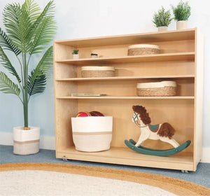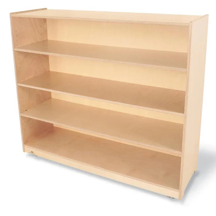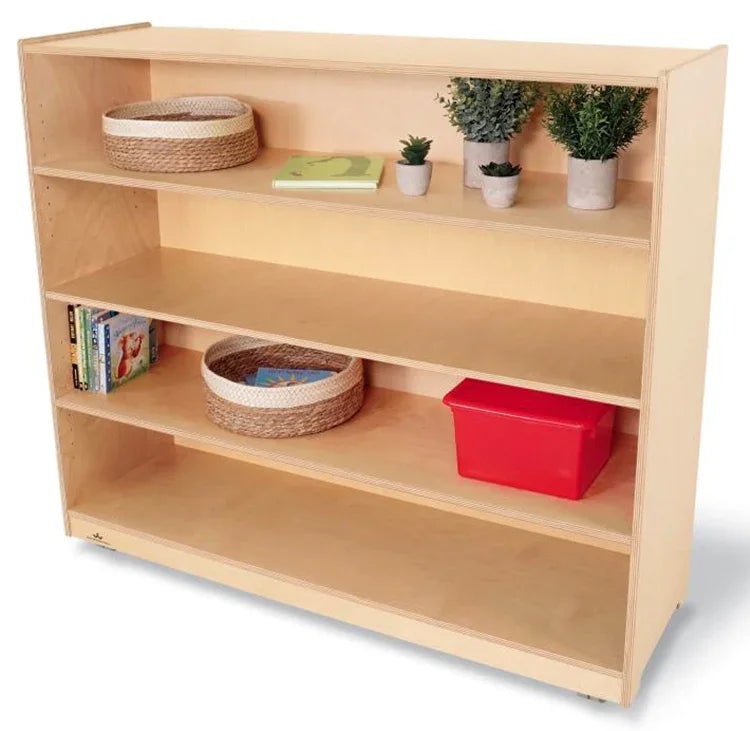 Economical and attractive mobile shelf storage cabinet! Our Shelf Cabinet family features standard dimensions of 15"D and 48"W. Shelf Cabinet features two fixed and two adjustable shelves that provide flexible configuration to accommodate a varied assortment of taller books, larger toys, stuffed animals or other large items. Mounted on four heavy duty non-marking casters; includes wall attachment brackets for safety. Need a different height? Check out the options in our Shelf Cabinet family: WB1843 54"H, WB1849 48"H, WB1853 36"H, WB1851 30"H and WB1852 24"H