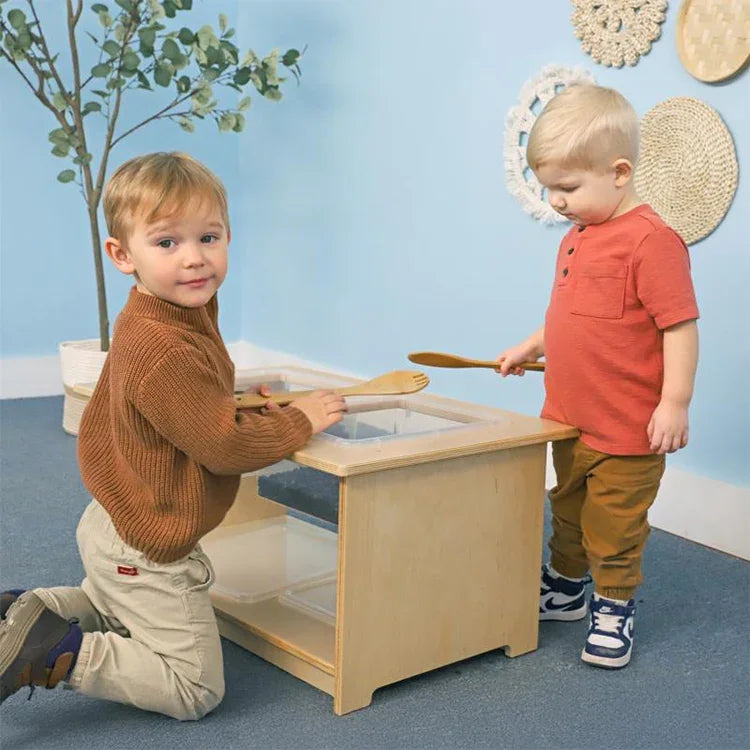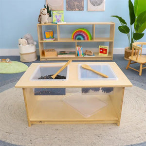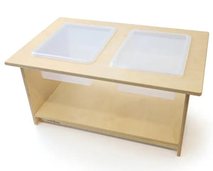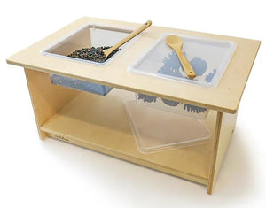 Sensory play for toddlers! Sensory Table features sturdy construction and a table surface that's just the right height to engage toddlers. Table is designed with two clear, surface mounted removable plastic trays with lids that hold sensory materials for little hands to explore and learn. There's plenty of room for storage underneath, including one open fixed shelf on the cabinet bottom that accommodates extra bins [sold separately] and makes clean-up a snap. All edges and corners are rounded over and sanded smooth for safety. Floor glides included. Need a different size? Check out our WB1775 Deluxe Mobile Sensory Table with Trays and Lids for preschoolers, sold separately.