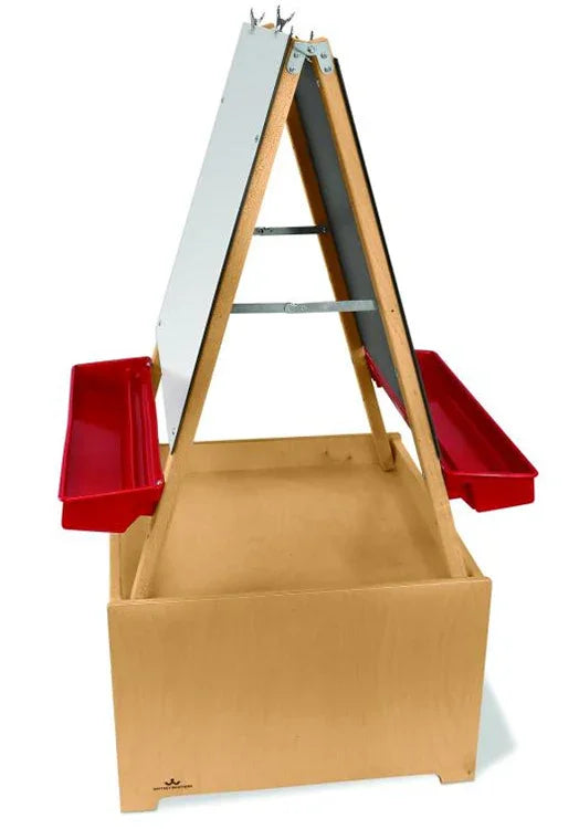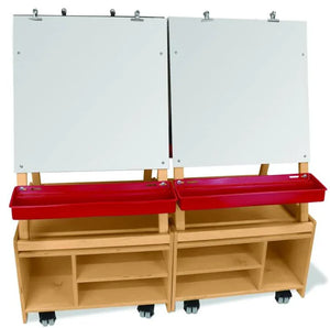Inspire their next masterpiece! Art is foundational to a child's view of the world. Our mobile art center base cabinet provides two children a unique and stylish platform to create and express their own views. The design of the sturdy base cabinet provides ample storage compartments below for art supplies and the top perimeter rail prevents items from falling off the cabinet surface. Cabinet is mounted on non-marking lockable casters for handy mobility.