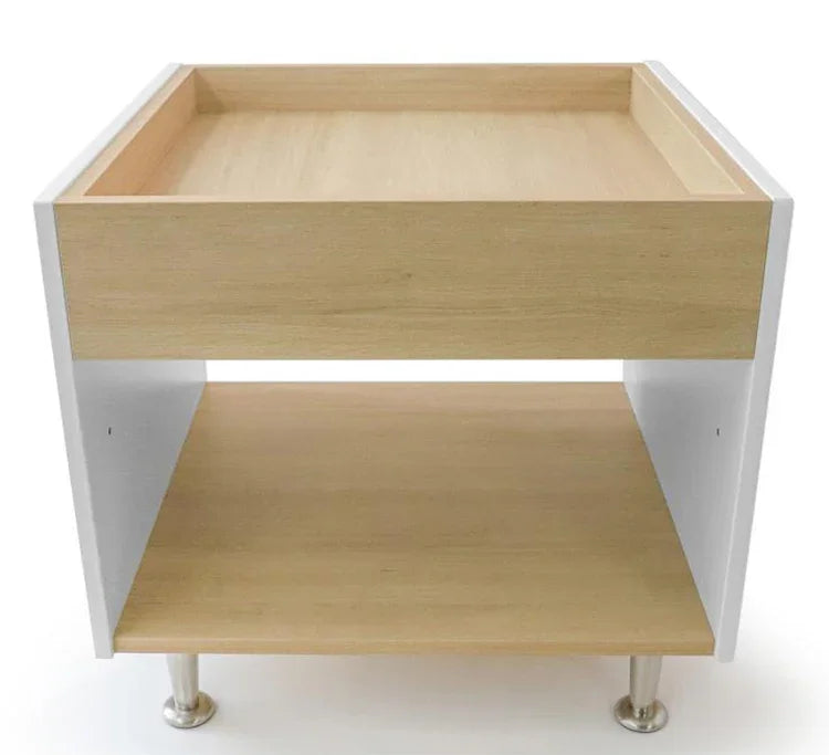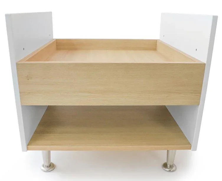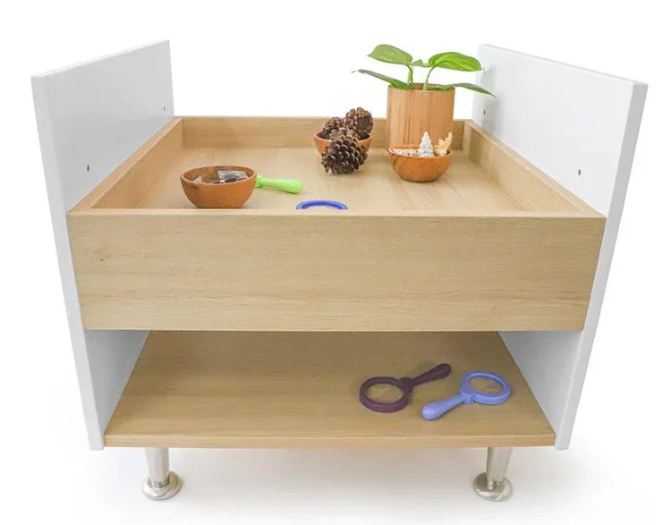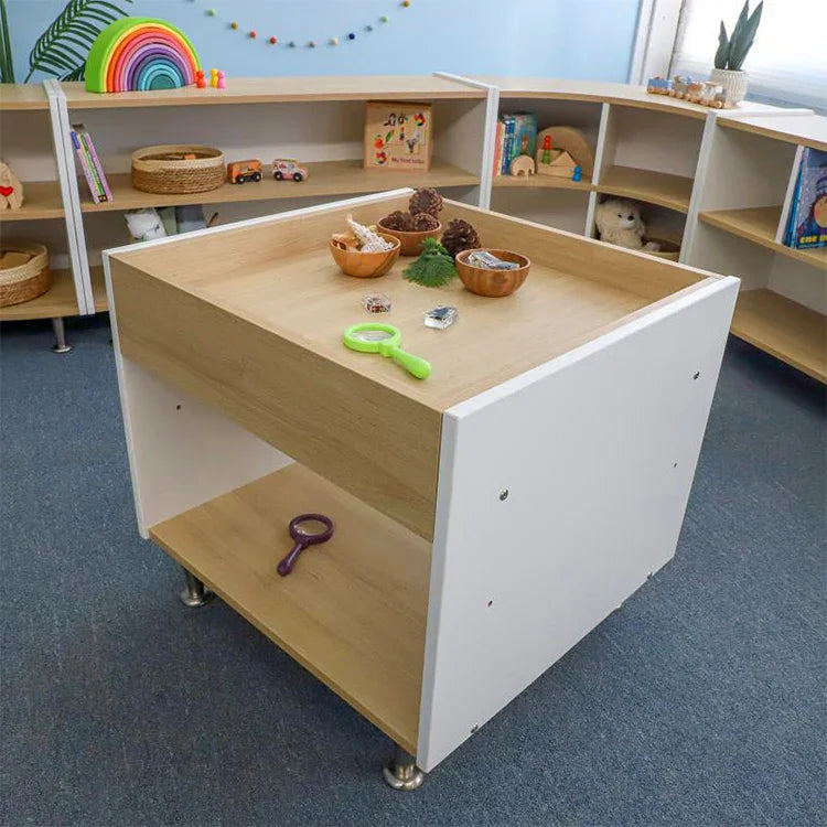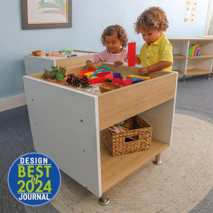 Foster creative play and exploration! Beautiful contrasting white and textured white oak panels form crisp, clean lines that add refined style to this table that's just the right for young children to reach, play and explore. Walls along the perimeter of the table surface prevent objects from falling off and the wide base provides sure-footed stability with ample storage underneath. Ships partially assembled and coordinates with all other pieces in the sophisticated contemporary and thoroughly modern elevatED™ Collection. Constructed in 3/4-inch thermofused white and textured white oak melamine with edge