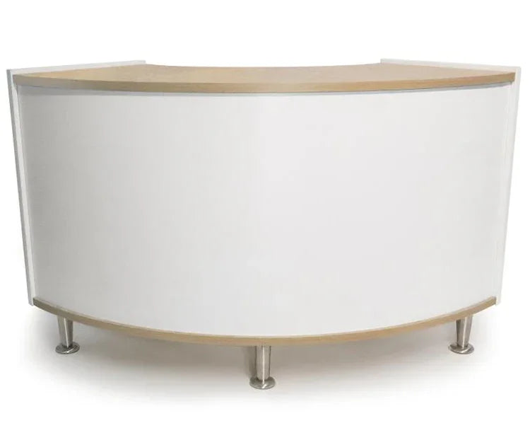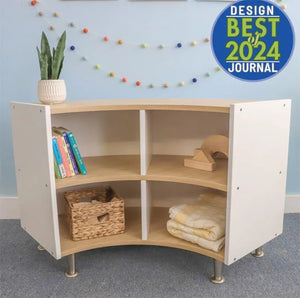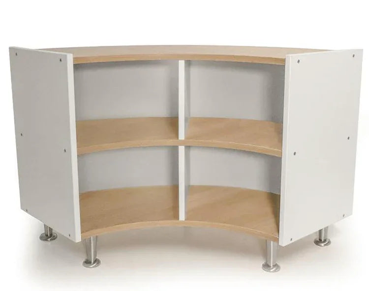 Tired of losing classroom storage space to corners, columns or jogs? Need to define a flexible activity area in an open classroom space? Solve both challenges in elegant modern style with curved back cabinets from the elevatED™ Collection! Contrasting white and textured white oak panels form pleasing curves offset by brushed nickel legs with integrated pads to protect floors. The back of the 27H cabinet curves out to negotiate a column, corner or other monument and two fixed shelves in front provide ample storage compartments. The cabinet is deeper to provide stability and more storage capacity. Combine with other storage cabinets in the sophisticated chic and thoroughly modern elevatED™ Collection to create a half-round, horseshoe, S-shape or other configuration! Constructed in 3/4" thermofused white and textured white oak melamine with edge banding