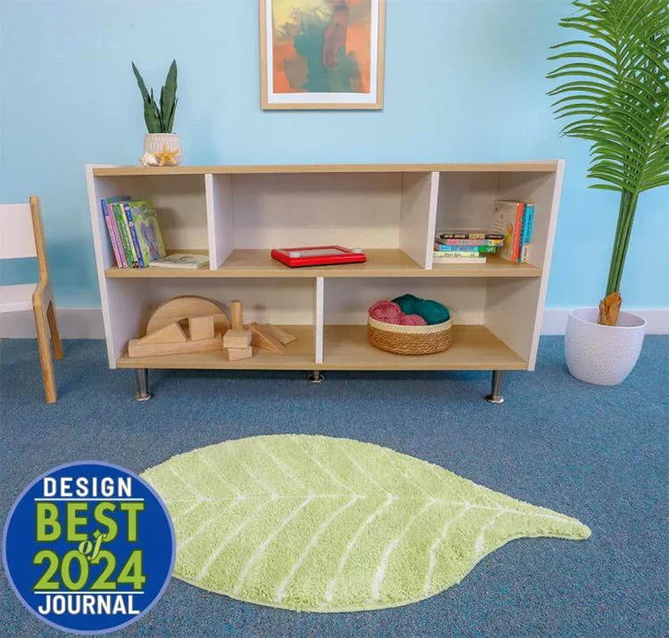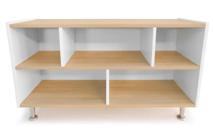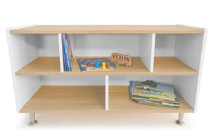Beautiful Preschooler-height storage cabinet features refined contrasting white and textured white oak panels that form crisp, clean lines offset by brushed nickel legs with integrated pads to protect floors. Two fixed shelves provide five divided storage compartments that put toys, books, manipulatives and what-not within easy reach of young children. Cabinet depth of 15" provides more storage capacity and the height aligns with all other 27"H pieces in the sophisticated chic and thoroughly modern elevatED™ Collection. Constructed in 3/4" thermofused white and textured white oak melamine with edge