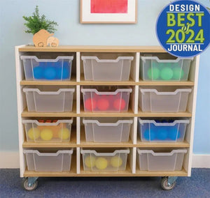 Compact mobile classroom storage in a crisp contemporary design! Refined contrasting white and textured white oak panels form crisp, clean lines for a sophisticated modern look. Twelve spacious cubby storage compartments hold twelve clear Gratnell trays that make it a snap to store, organize, identify and retrieve items. Trays are easily removed and replaced by children after playtime or classroom use and the cabinet is deeper to provide stability and more storage capacity. Four inch heavy duty locking casters are through-bolted for extra durability. Coordinates with all other pieces in the sophisticated chic and thoroughly modern elevatED™ Collection. Constructed in 3/4" thermofused white and textured white oak melamine with edge bandingcontemporary design!