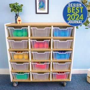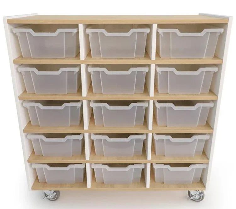 Compact mobile classroom storage in a crisp contemporary design! Refined contrasting white and textured white oak panels form crisp, clean lines for a sophisticated modern look. Fifteen spacious cubby storage compartments hold fifteen clear Gratnell trays that make it a snap to store, organize, identify and retrieve items. Trays are easily removed and replaced by children after playtime or classroom use and the cabinet is deeper to provide stability and more storage capacity. Four inch heavy duty locking casters are through-bolted for extra durability. Coordinates with all other pieces in the sophisticated chic and thoroughly modern elevatED™ Collection. Constructed in 3/4" thermofused white and textured white oak melamine with edge bandingcontemporary design!