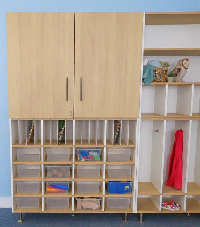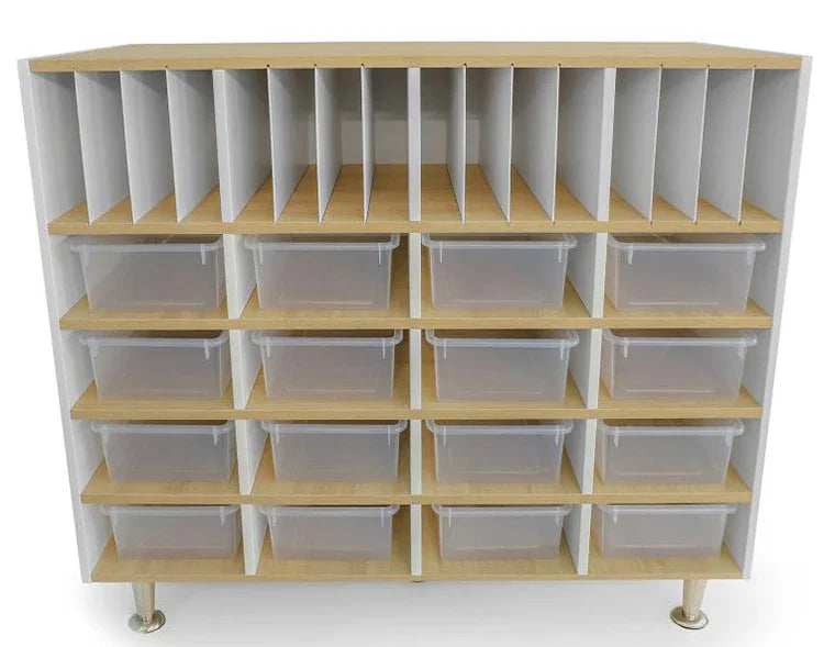 Versatile storage cabinet includes 16 vertical compartments with removable slotted dividers atop four rows of four-across cubby compartments that makes it a snap to keep school work organized in a busy classroom. Contrasting white and textured white oak panels form crisp, clean lines offset by brushed nickel legs with integrated pads to protect floors. Includes 16 clear plastic trays. Coordinates with all other pieces in the sophisticated chic and thoroughly modern elevatED™ Collection. Constructed in 3/4" thermofused white and textured white oak melamine with edge banding and no visible screws or unsightly plastic joinery for a beautiful finished furniture look. Ships fully assembled; attach the legs. Made in USA. GreenGuard™ Gold Certified. Lifetime Warranty.