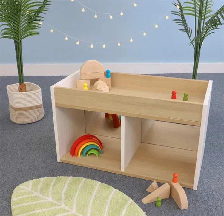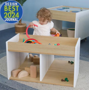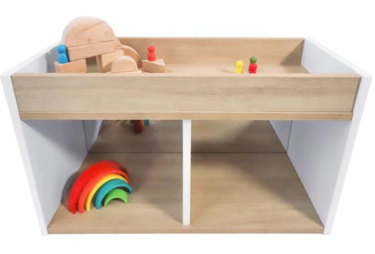 - Top includes a 3" deep storage well keeps playthings within sight and easy grasp