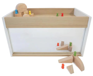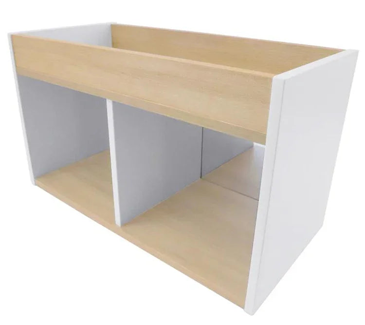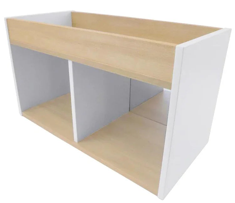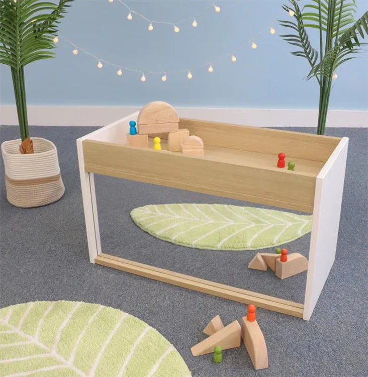 Refined contrasting white and textured white oak panels form crisp, clean lines. Mirrored storage cabinet just the right size to support, engage and encourage toddlers as they develop mobility and coordination through exploration and play. Features a safe, shatter-resistant acrylic mirror mounted on the front with two spacious mirrored storage compartments in the back. Top surface includes a 3" deep storage well to keep playthings within sight and easy grasp. Coordinates with all other pieces in our sophisticated chic and thoroughly modern elevatED™ Collection. Ships fully assembled. Constructed in 3/4" thermofused white and textured white oak melamine with edge banding. Made in USA. GreenGuard™ Gold certified. Lifetime Warranty