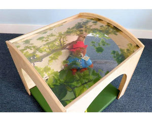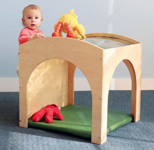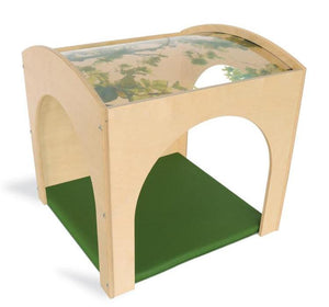 Nature-inspired retreat for toddlers!! Curved roof of this play house features a safe, shatterproof acrylic panel imprinted with the realistic image of a spreading tree canopy that beckons children inside for a peaceful break yet provides easy visibility for adult supervision. Bright and cozy interior includes an oversized tunnel opening on the front and two side panels and maximum visibility of children inside. Set includes a fitted green floor mat. Coordinates seamlessly with all other pieces in our award-winning biophilia-inspired Nature View Collection [each piece sold separately]. Bring nature indoors and create a quiet space that children will love!
