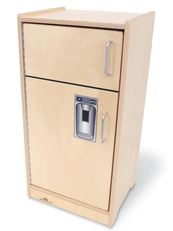 Just like home and right-sized for toddlers! Our Let's Play Toddler Refrigerator brims with delightful character in a fresh contemporary design, natural color, and realistic details including a water / ice dispenser and real cabinetry handles that will inspire a toddler's imaginative play for hours. Thoughtful safety features include smoothed edges, eased corners and a single door attached by a continuous top-to-bottom piano hinge to prevent little fingers from getting pinched. Combine with our Let's Play Toddler items [each sold separately] to create a complete toddler kitchen ensemble! Constructed in beautiful, durable birch plywood in safe, non-toxic natural UV finish that won't yellow and withstands rigorous use. Made in USA. GreenGuard™ Gold certified. Lifetime Warranty. Certified antimicrobial.