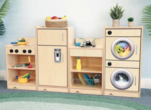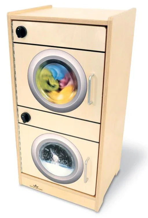 Just like home and right-sized for toddlers! Our modern washer / dryer combo is full of delightful character with a unique contemporary design, cabinet handles in matte chrome finish, knobs that click, realistic printed details natural finish that will inspire children for hours of imaginative play. The single door features realistic washer / dryer images and is attached by a top-to-bottom continuous piano hinge to prevent little fingers from getting pinched. Combine with other Let's Play items [each sold separately] to create a complete toddler kitchen ensemble! Constructed in beautiful, durable birch plywood in safe, non-toxic natural UV finish that won't yellow and withstands rigorous use. Made in USA. GreenGuard™ Gold certified. Lifetime Warranty. Certified antimicrobial.