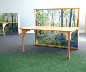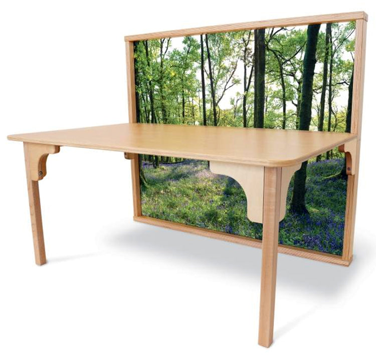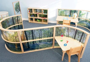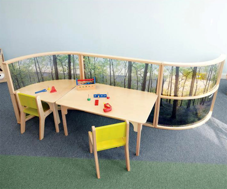Stunning woodland scene on the curved acrylic panel together with the 20"H table create a calming and comforting personal space for children to read, draw, color, create or focus without distraction or compromising visibility for adult supervision. Combine with our Nature View Serenity Pod and Whitney Plus Chairs [each sold separately] to create unlimited layout possibilities and an aesthetically pleasing and flexible classroom space that integrates seamlessly with all other pieces in our award-winning biophilia inspired Nature View Collection. Constructed in safe, shatter-resistant acrylic, 1-inch and 5/8-inch birch plywood, and beautiful 1-1/4 inch solid maple in non-toxic natural UV finish that won't yellow and withstands rigorous use. Ships by Truck. Made in USA. GreenGuard™ Gold certified. Lifetime Warranty. Certified antimicrobial.