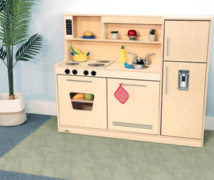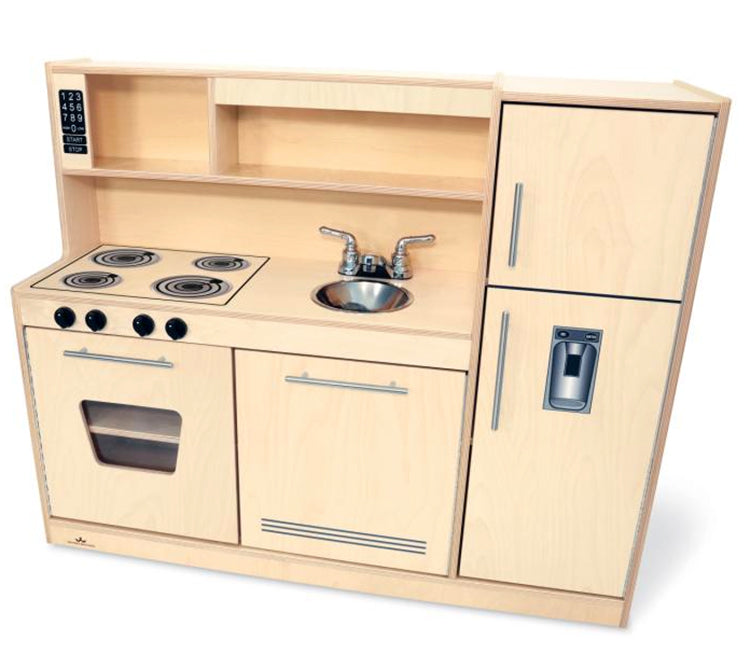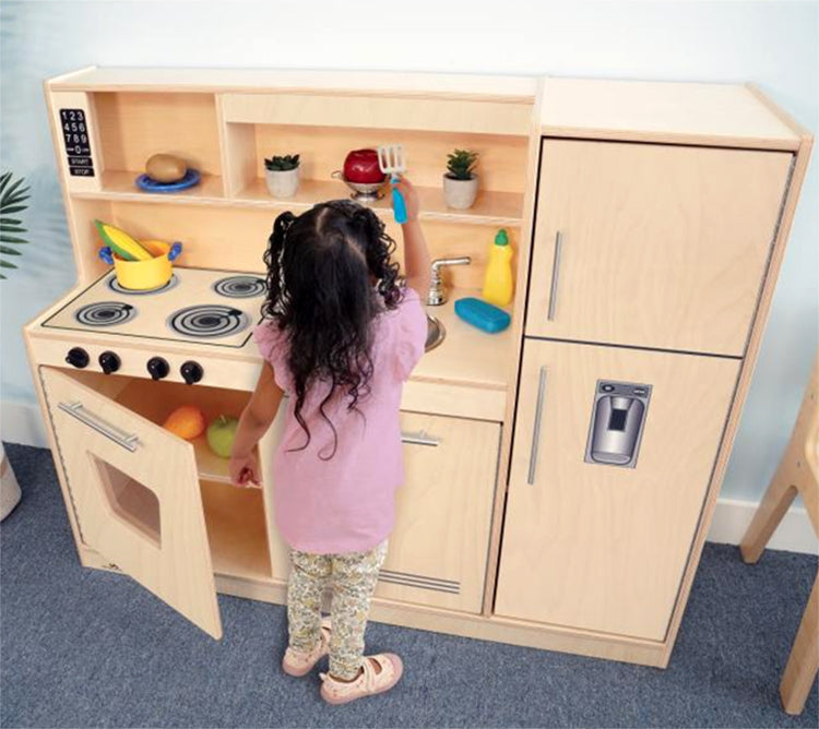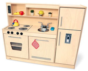 Compact all-in-one kitchen combo saves spaces, includes an integrated stove, sink, refrigerator and hutch in a compact footprint. Brims with delightful character and features a fresh contemporary design, warm natural wood color. Cabinet handles in matte chrome finish, knobs that click, a real chrome faucet with working handles, stainless sink basin and realistic printed details to inspire a preschooler's imaginative play for hours. Thoughtful safety features include smoothed edges, eased corners and doors attached by continuous top-to-bottom piano hinges to prevent little fingers from getting pinched. Constructed in beautiful, durable birch plywood with no visible screws or joinery for a nice finished furniture look in safe, non-toxic natural UV finish that won't yellow and withstands rigorous use. Made in USA. GreenGuard™ Gold certified. Lifetime Warranty. Certified antimicrobial finish.